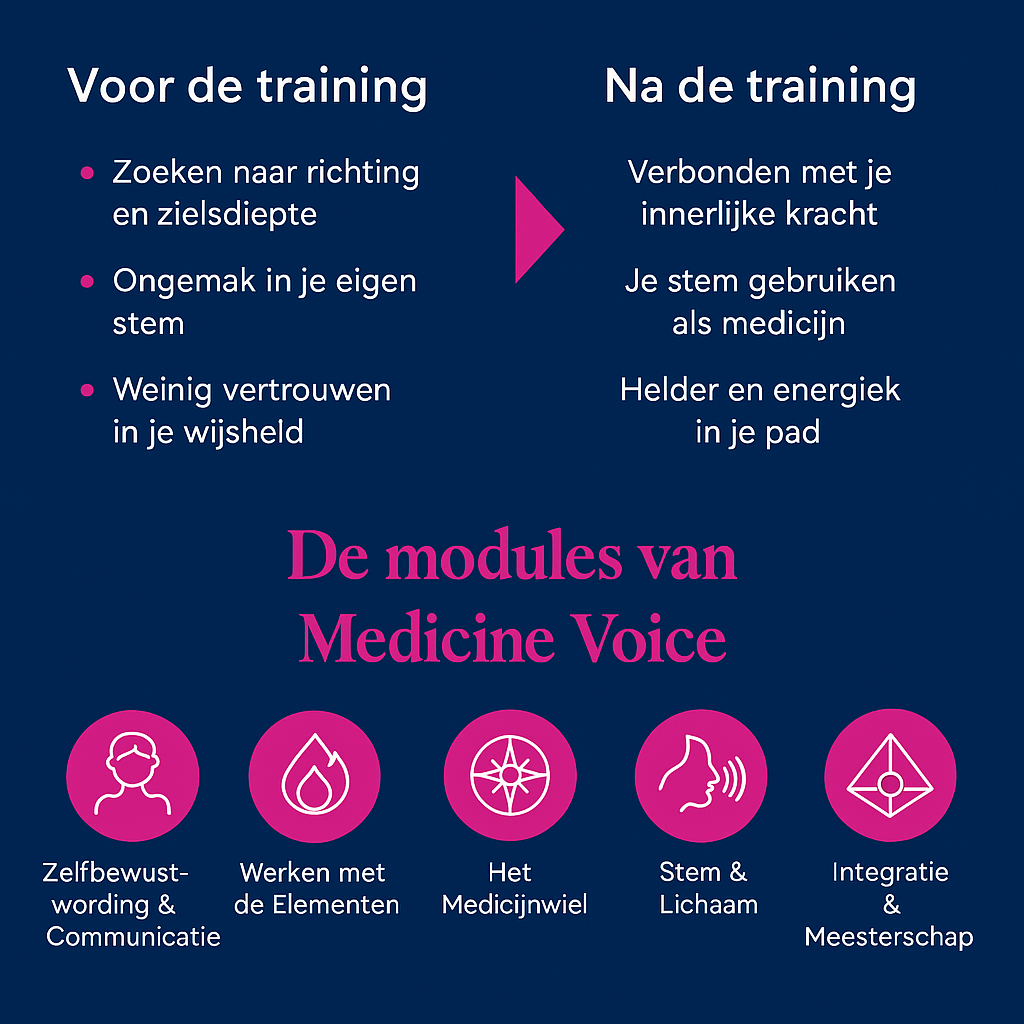 Daar ontstond Medicine voice; een praktijkgerichte sjamanistische jaartraining die jou uitnodigt hetzelfde te doen. Een reis waarin je obstakels leert overwinnen zonder strijd, en leert werken mét de energie van je hart in plaats van ertegenin. Een pad waarin jij je vrij voelt van stigma en dogma van de (socials) wereld, zodat je de tools hebt om dicht bij jezelf te blijven en anderen te helpen dicht bij zichzelf te zijn. Dat je je niet meer laat leiden wat anderen vinden, want jij weet; ‘Ik heb iets waardevols te brengen in deze wereld’.
